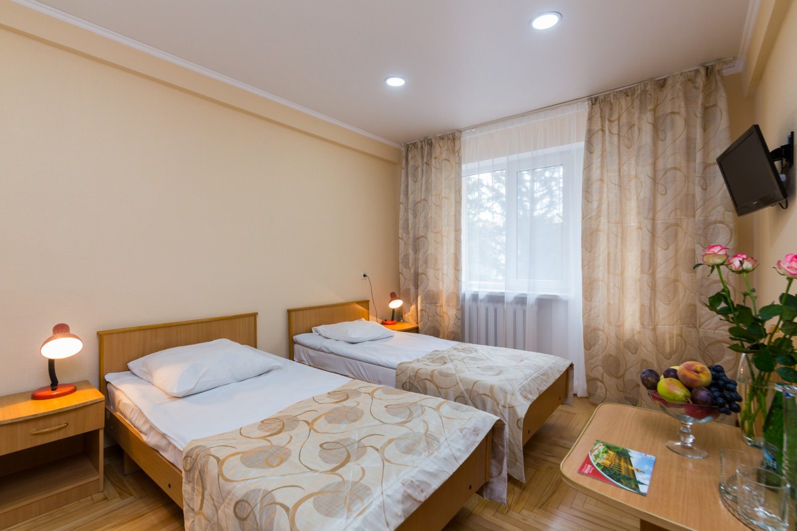 Номер площадью 14 кв.м оснащен ТВ, холодильником и электрочайником.